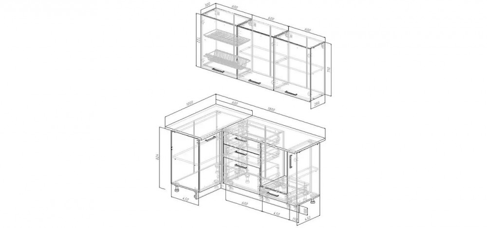 Фасады верхних модулей со свесом 12 мм дают возможность использовать без установки ручек.