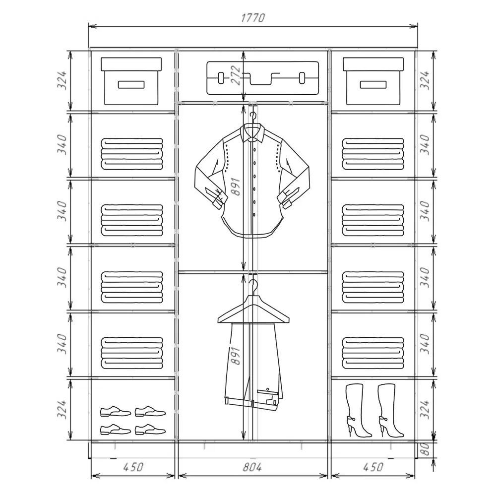 Модель 3-х дверного шкафа (полки по краям)