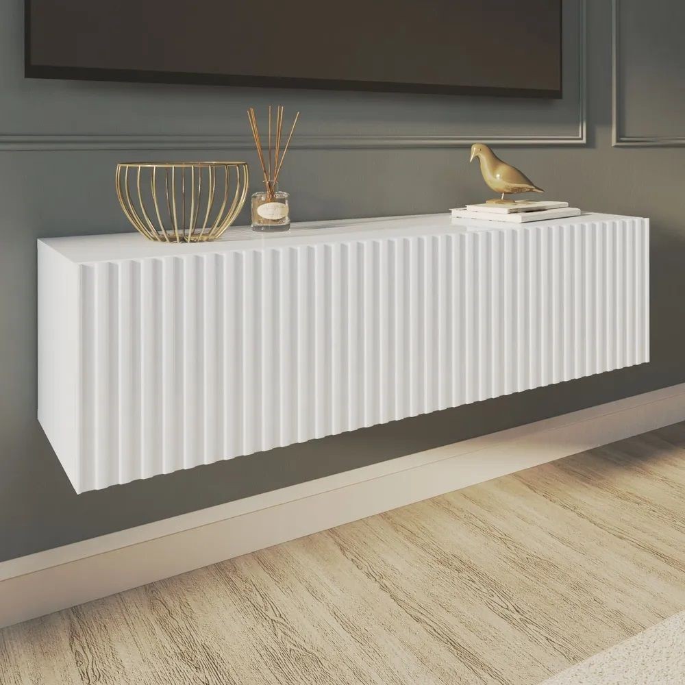 Благодаря своей компактности тумба под ТВ подвесная поможет сэкономить пространство, избежать ощущения загромождённости гостиной, спальни или детской комнаты, а рифлёный фасад будет акцентировать